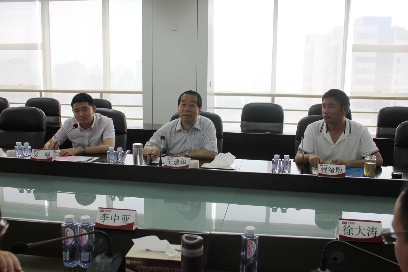 8月23日上午,濟(jì)寧市兗州區(qū)惠民城建投資有限公司董事長(zhǎng)王建華、副總經(jīng)理程緒殿、董事會(huì)秘書(shū)吳鵬一行蒞臨國(guó)盛公司,針對(duì)地方金融服務(wù)平臺(tái)建設(shè)進(jìn)行交流座談。國(guó)盛公司總經(jīng)理李中亞主持會(huì)議,投融資管理部、金融拓展部等相關(guān)部門(mén)負(fù)責(zé)人參加座談會(huì)。